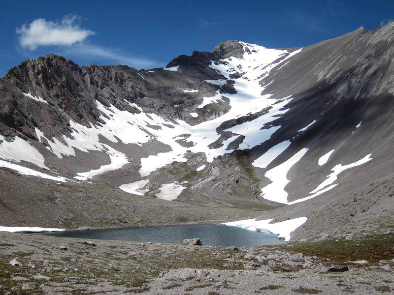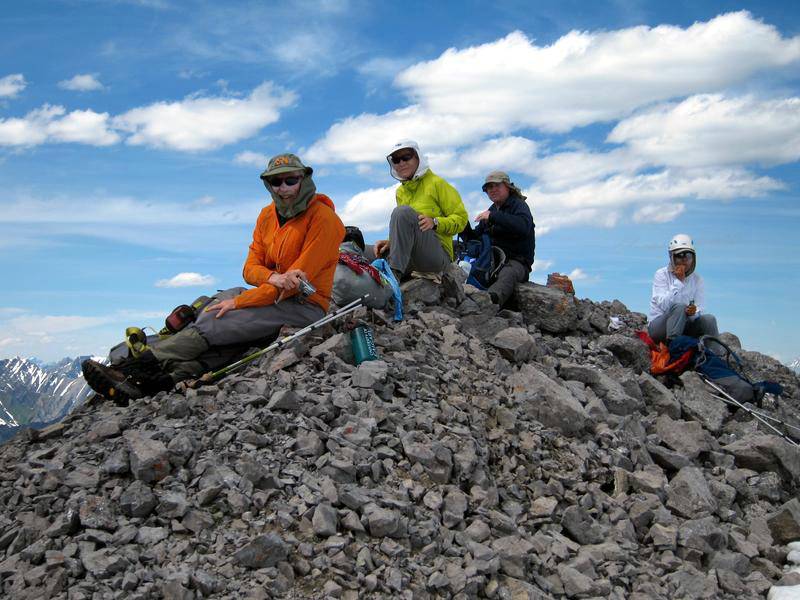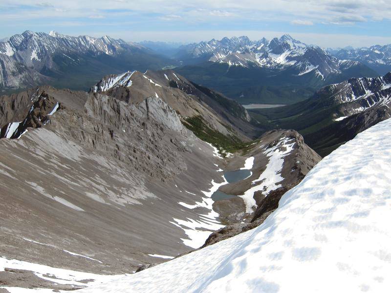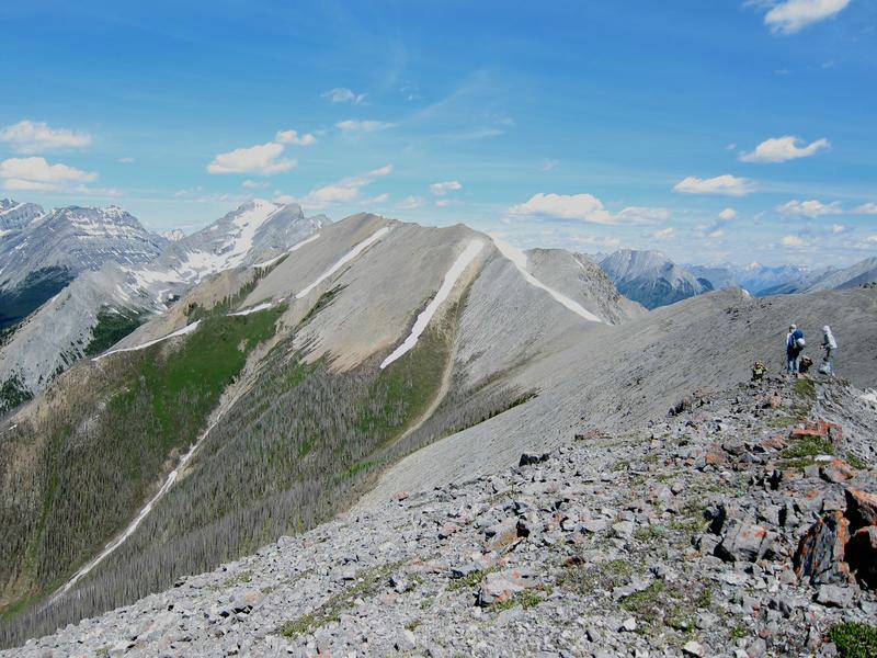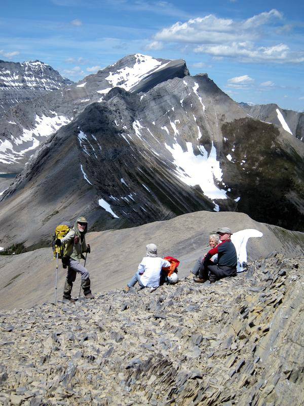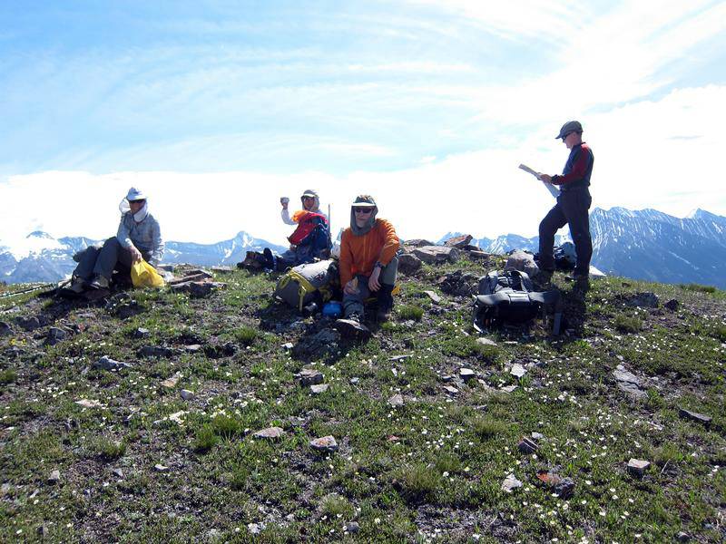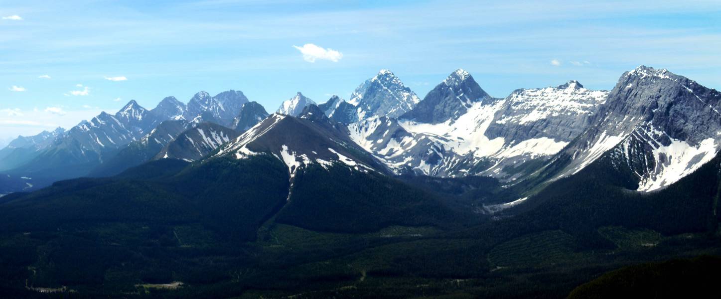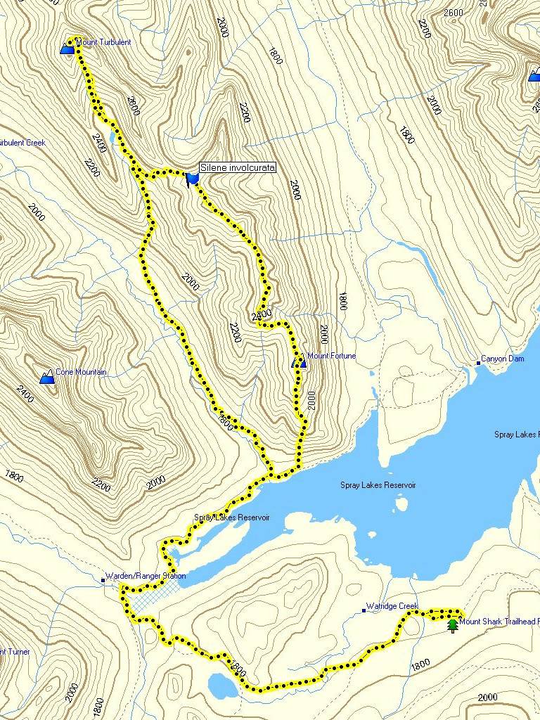 The day starts with a bike trip from the Mt Shark trailhead across and down to the Spray River bridge, around to the Bryant Creek bridge and then along the Spray reservoir to the Turbulent Creek bridge. The trail is good all the way. We left the bikes at the bridge, then continued along the reservoir until we were directly south of Mt Fortune. Steep flower covered slopes with some deadfall led to the summit. While not far above treeline at 2332 m, great views were had of the peaks from Mt Sparrowhawk around to the Royal group.