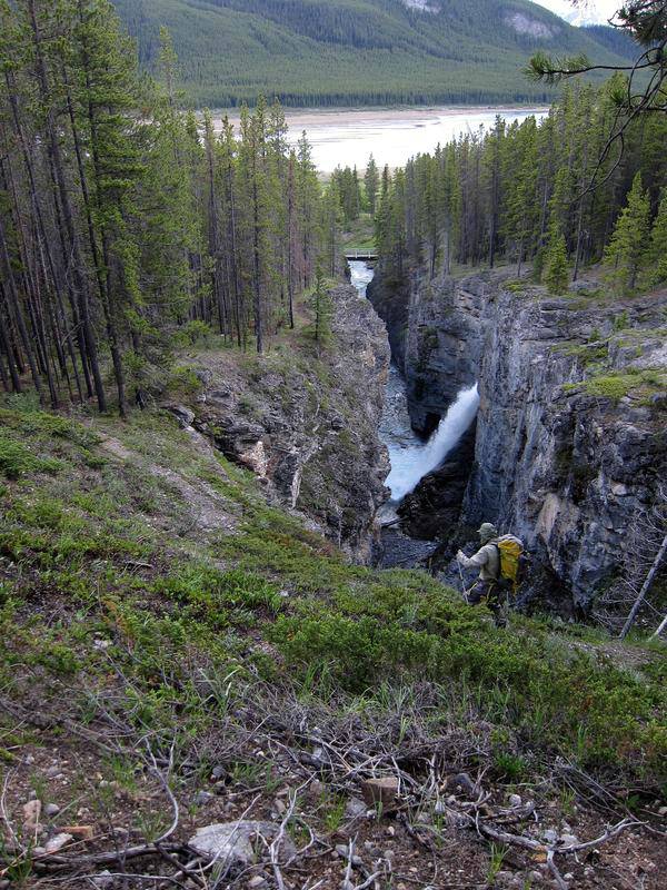 On the descent, the snow again provided a welcome alternative to the scree. We dropped out of the hanging valley to upper Turbulent Creek, and then followed game trails back to the road. Turbulent Creek cuts through a canyon just above the road, and goes over a substantial waterfall.