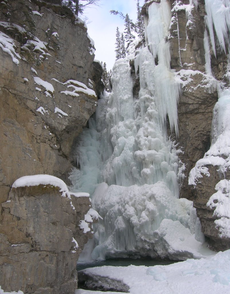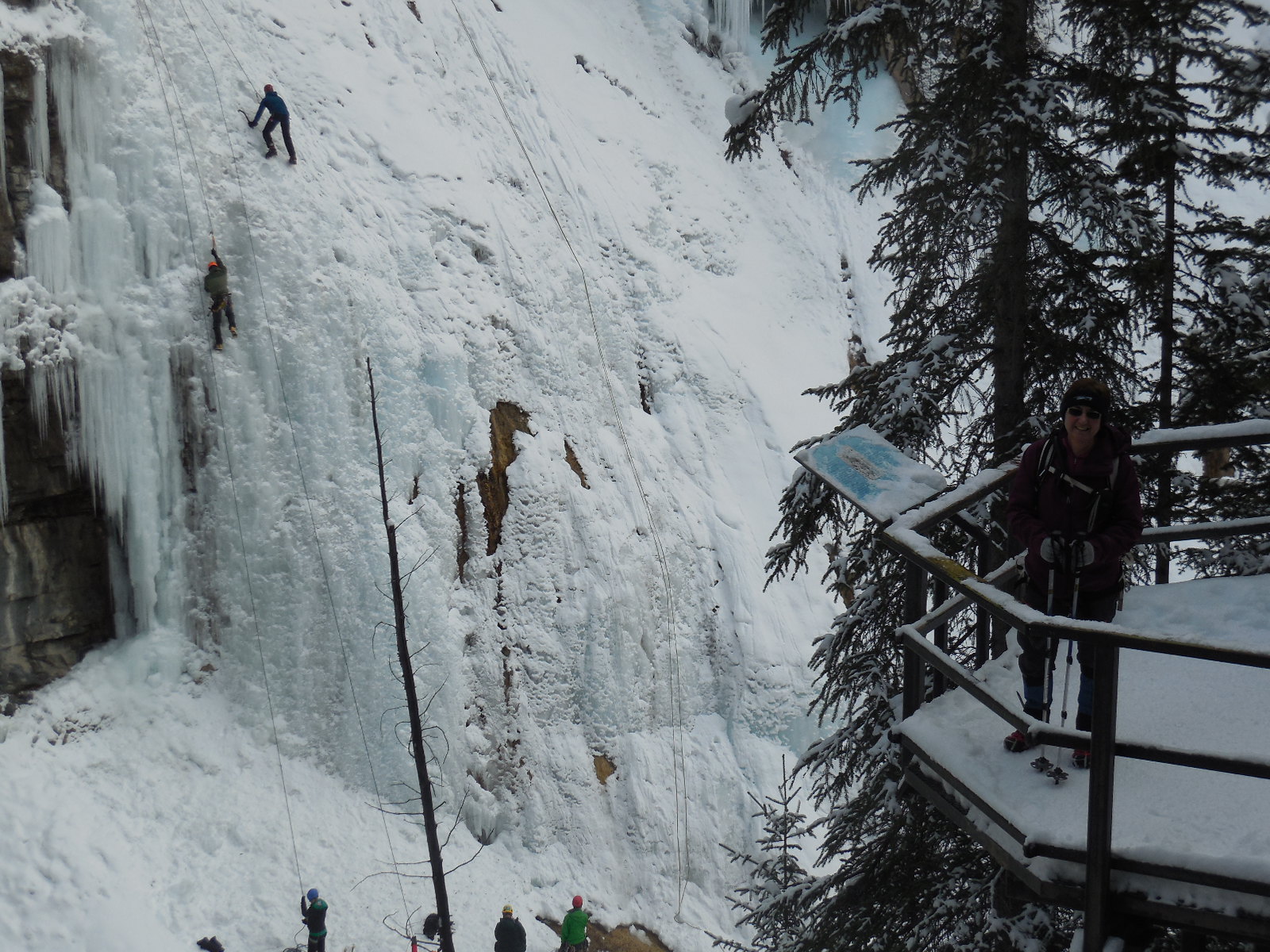 We wore our microspikes up through Johnston’s Canyon, but plain boots would have been sufficient as the trail was all packed snow, rather than the usual ice. The creek had a lot of open water, with the ice curtains and frozen waterfalls partially formed and very beautiful. Despite the early stage of the ice, we watched several ice climbers near the upper falls.