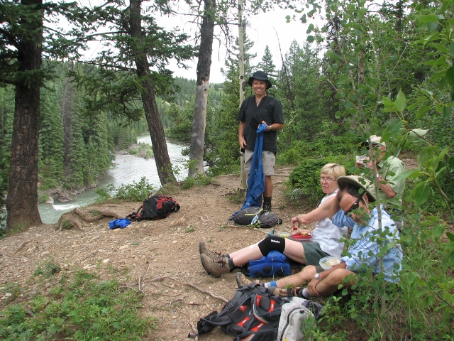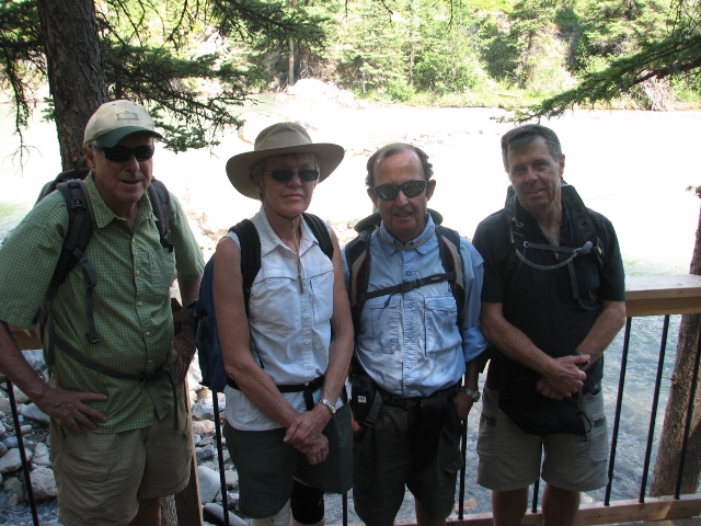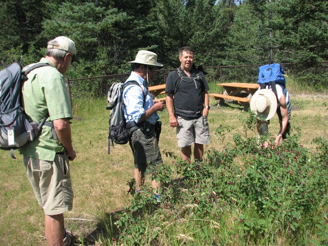 It was just a perfect summer day as we enjoyed a laid-back walk along the lower Kananaskis River on our way to the annual Ramblers BBQ at the Opal picnic area. Parking at the Barrier Lake visitor centre, we hiked first to the Canoe Meadows area and then to the Widow Maker area, enjoying grazing on just ripe, juicy Saskatoon berries at Canoe Meadows. We had lunch high above the river. We saw various viewing platforms and movable gates used for kayak races on the river. After a coffee stop at the Delta Hotel in the Village we hit Highway 40 for an exciting wildlife sighting, as a large bear (possibly grizzly) bounded across the highway right in front of a large truck, which produced quite a cloud of smoke in the emergency braking operation. On the return drive we saw four Bighorn rams near Baldy Mountain. The BBQ was the perfect opportunity to catch up with many Rambler friends.