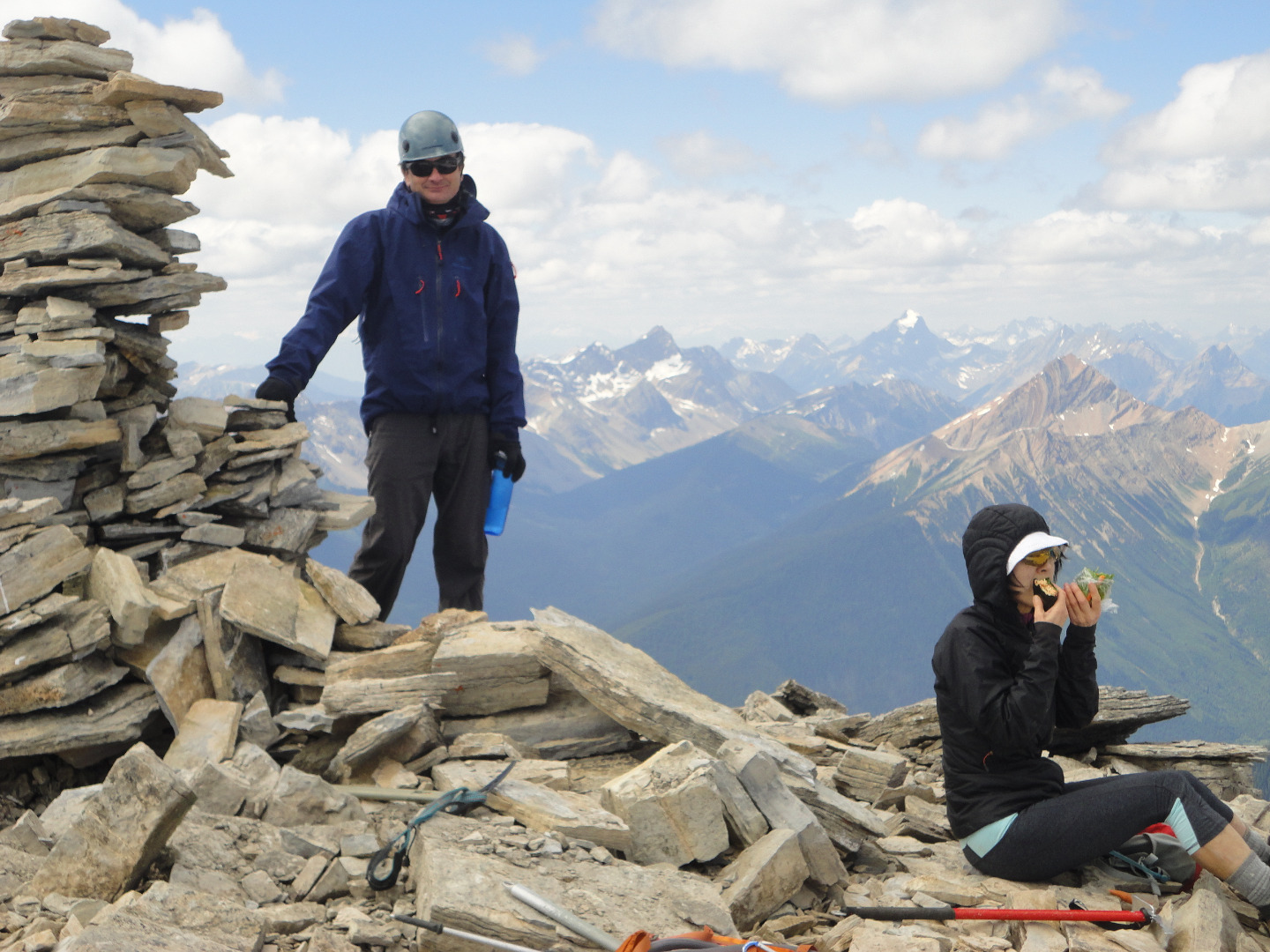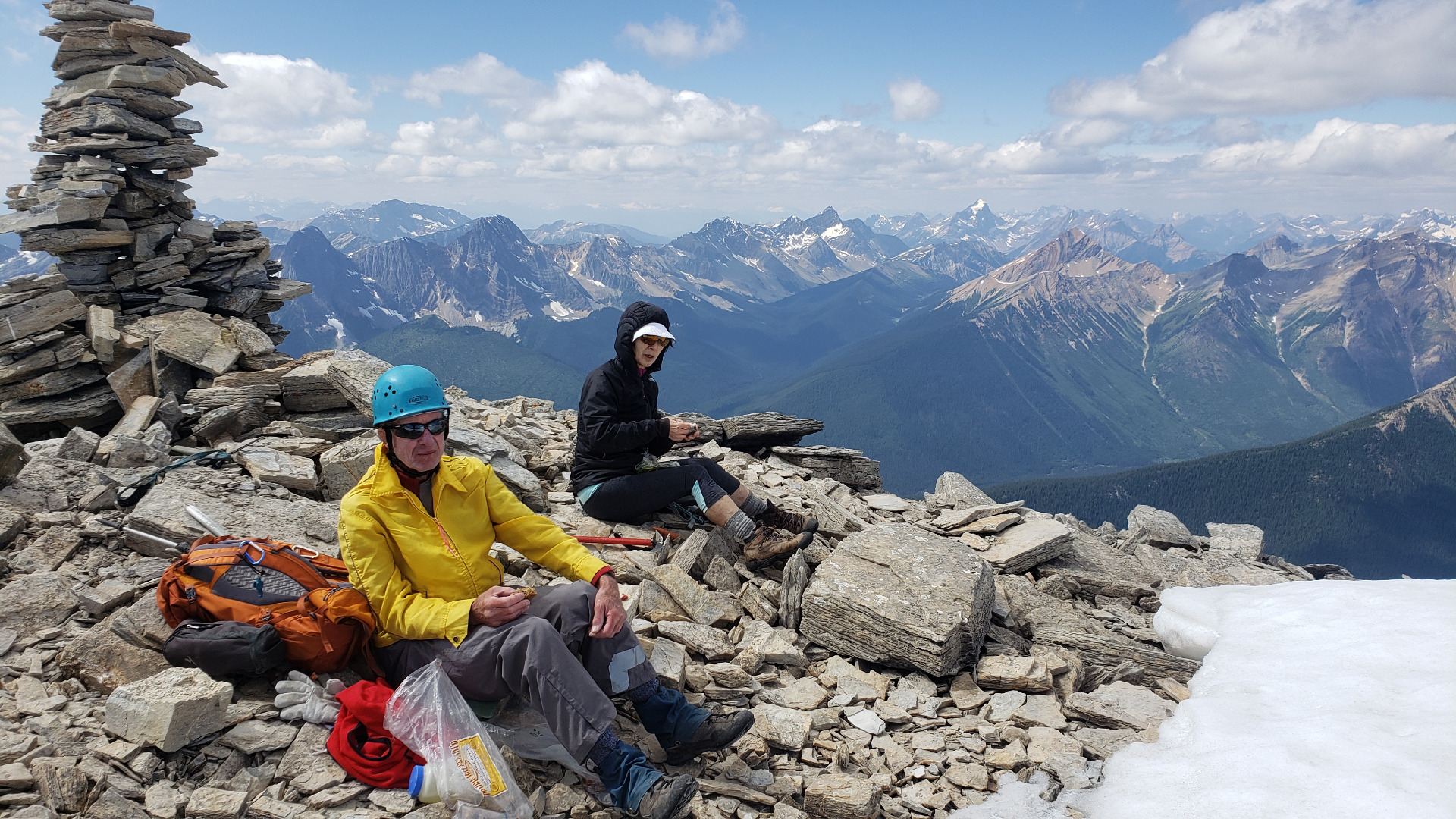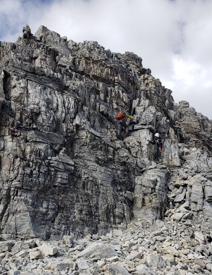 For the most part these were tackled straight on, but higher up we deviated to climber's left to ascend in a series of steps (sort of). At one point we encountered a snow gully which we were uncomfortable crossing even with ice-axes, so we found a good higher route. The axes were never actually used. Cairns were in abundance, They were mostly useful but at least on one cliff they were misleading. We reached the summit about 2.30pm for a late lunch.