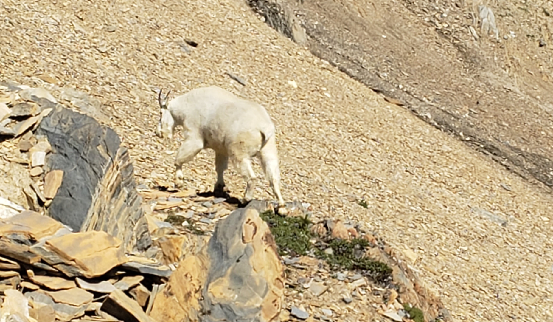 We crossed the outlet stream and followed a rough trail up a drainage and eventually onto the open ridge with a cairn. Enroute we admired 2 magnificent goats.
