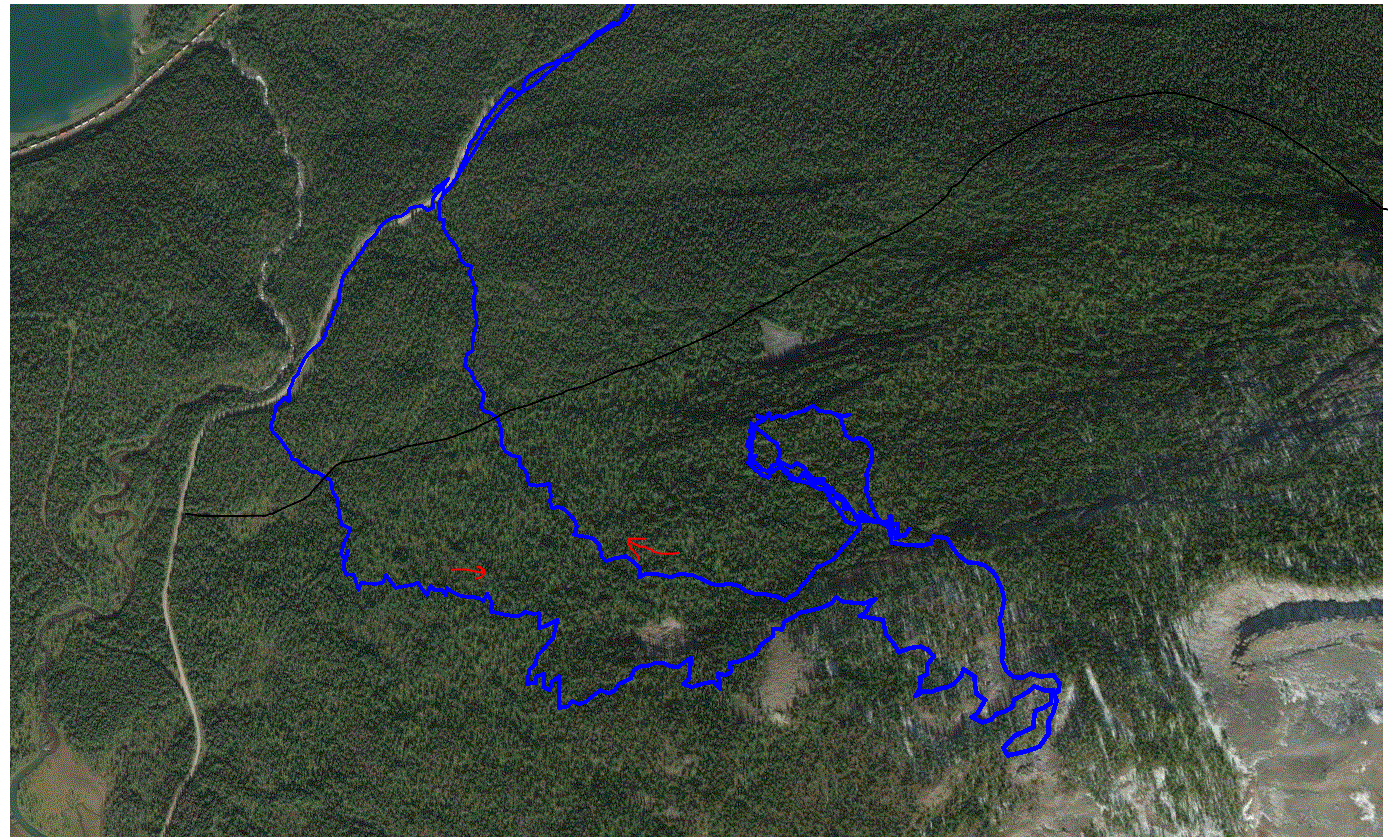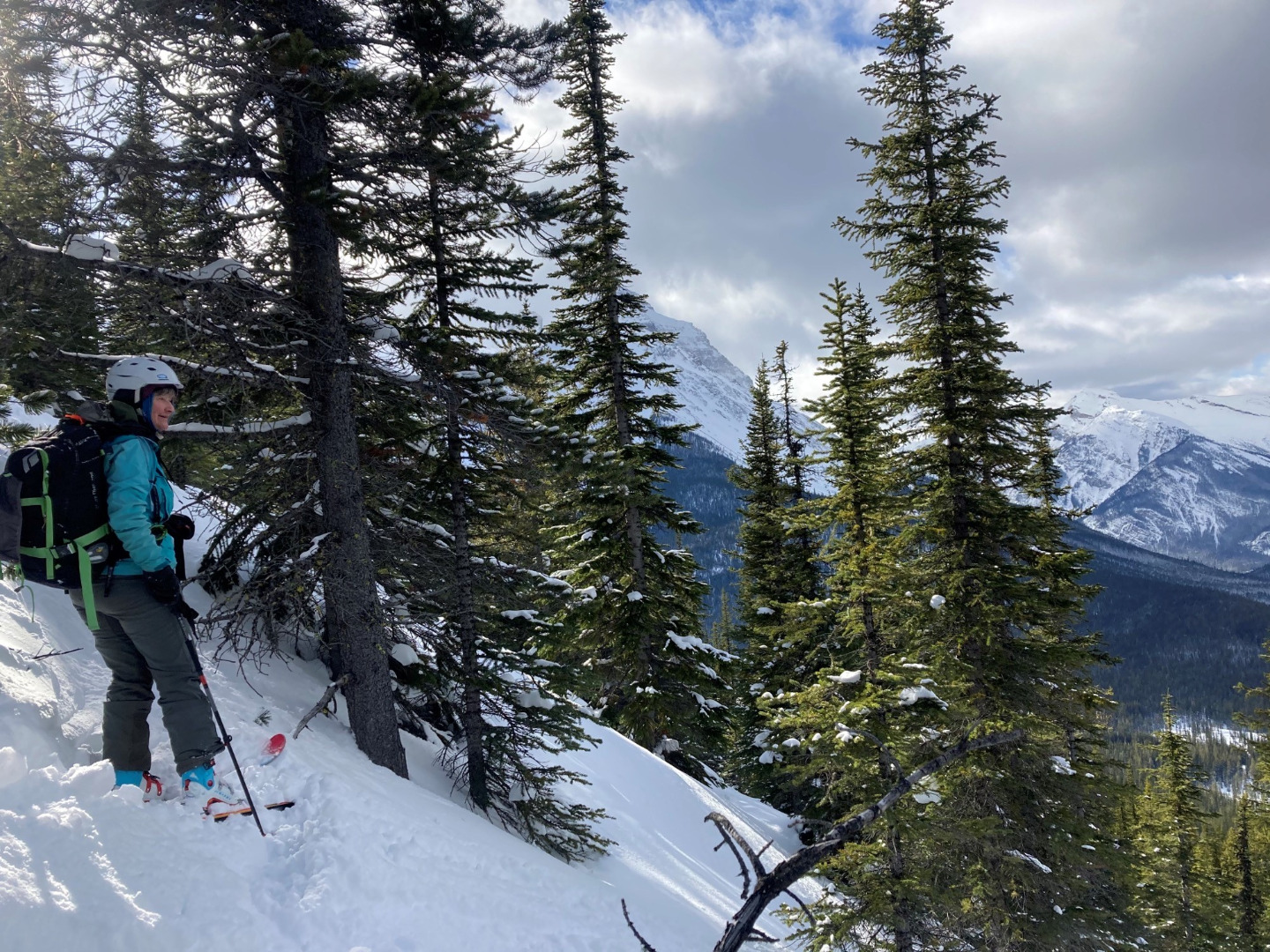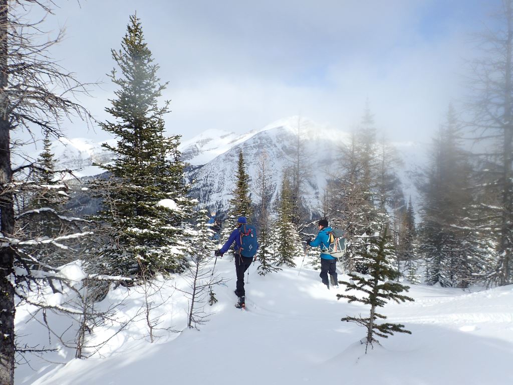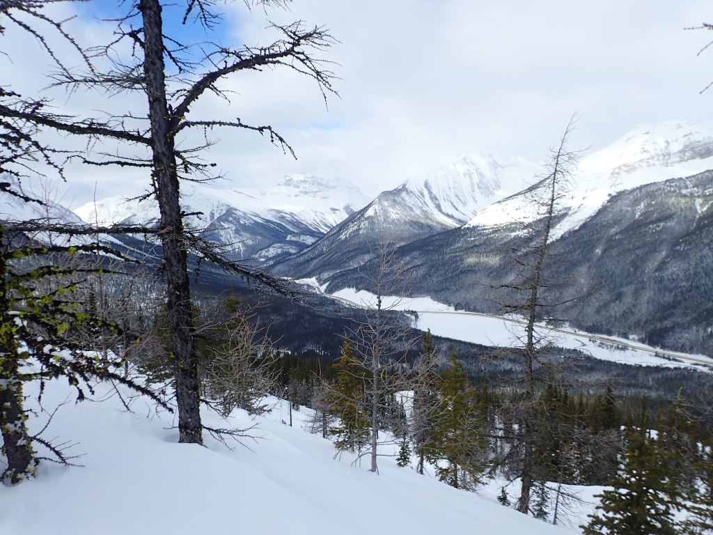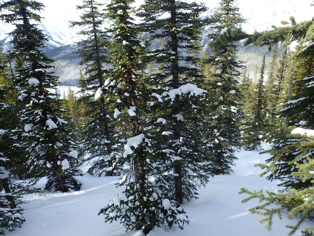 The trip did not work out as well as I had hoped for or expected. While there was 6 to 10 inches of new snow it did not cover the plethora of rock hard old tracks in the glades left by an army of young bucks from Canmore. Perhaps the trees have grown a little and erosion has steepen the slopes somewhat. We headed up the Lake O'Hara road and after 2.194 km found a good uptrack following it all the way up to the end of the trees.