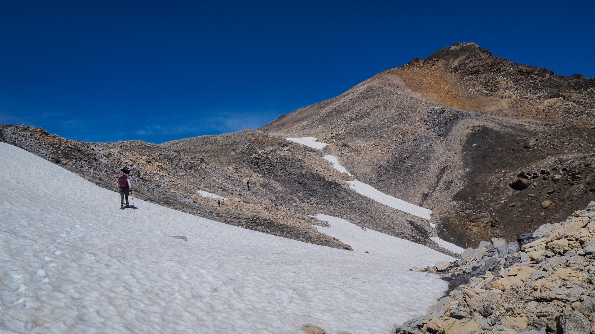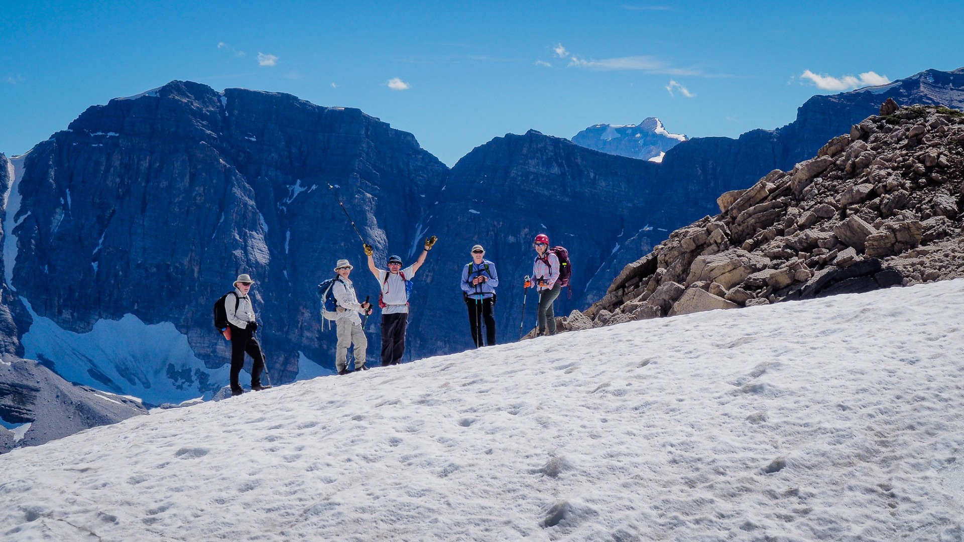 It was steep with lose rock, typical terrain in the Canadian Rockies. On the way up Carl recommended veering left toward the trees, which I discovered was the better way to go. Others chose a different way and apparently for them the struggle was real. Once we reached the ridge, travel became easier on a broad plateau that led to the summit base. We took advantage of snow patches that littered the alpine.