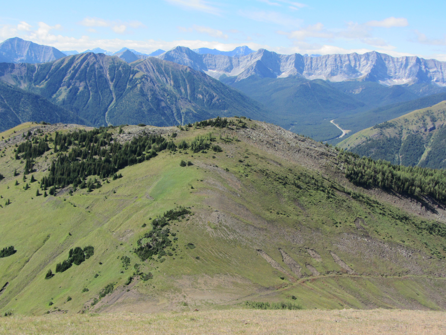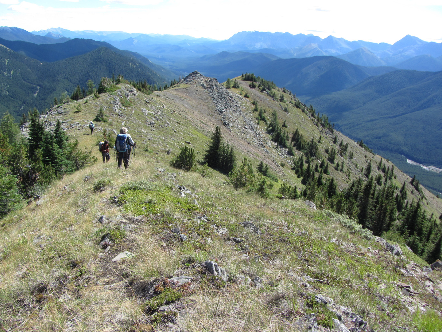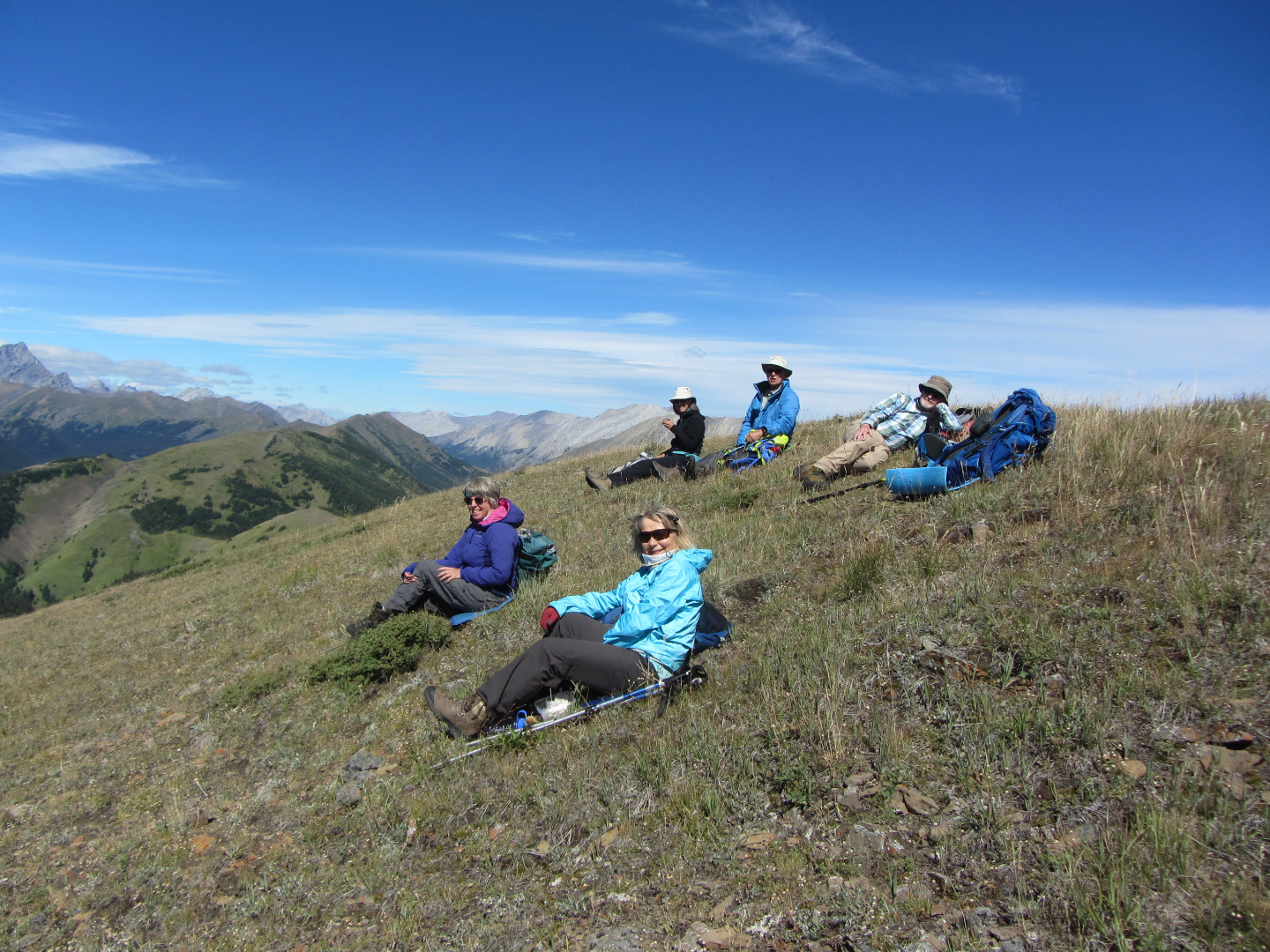 It turned out to be a good spot for lunch with the bright sunshine mostly offsetting the coolness of the breeze (a mini-thermometer registered 15C). We had a fine view of our next objective, the West hill (it is steeper than it looks!) and beyond up the Highwood Valley: