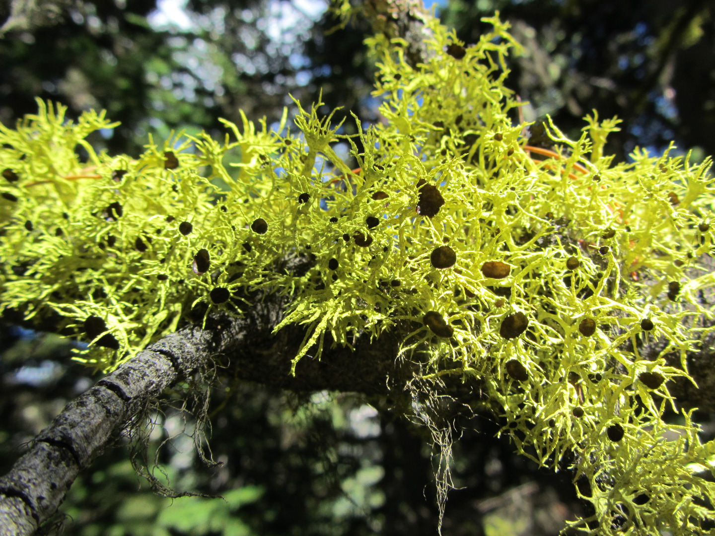 The black "eyes" are the fruiting bodies that produce the spores. Its cousin, the common wolf lichen (Letharia vulpina) doesn't have the eyes.