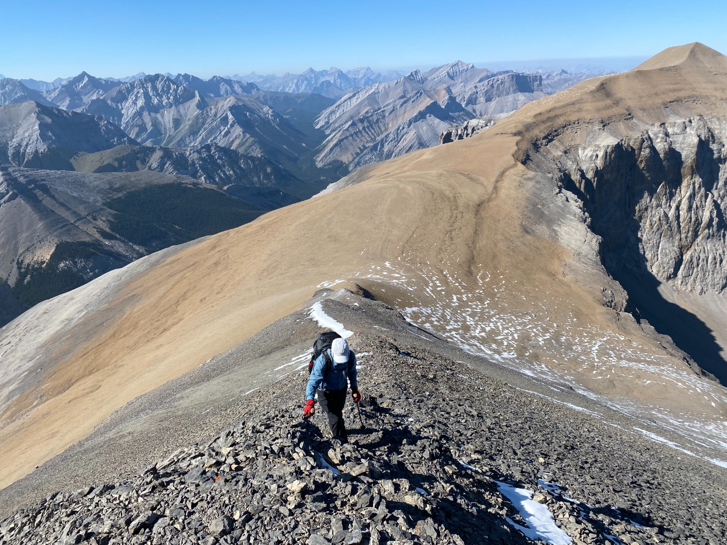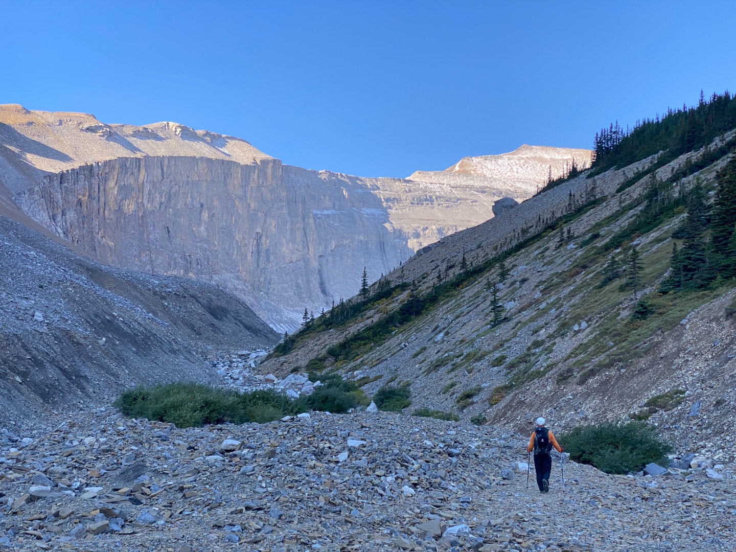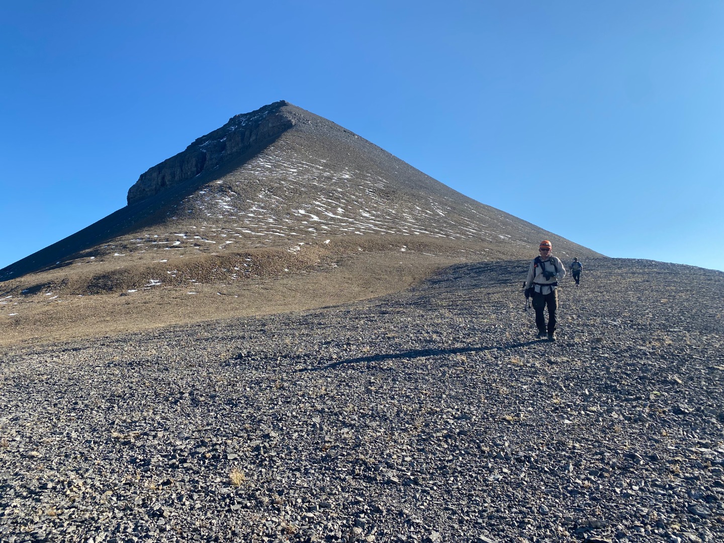 From Mount Glasgow, it took us 1.5 hours to walk up Mount Cornwall, where we arrived at 2:00 pm. After a 15 minute break, we headed to Outlaw Peak, arriving at the summit at 3:00 pm, 45 minutes later. We took a 30 minute break on Outlaw, and at 3:30 pm we headed for Banded Peak, where we arrived at 4:45 pm, 1.25 hours later. We left the summit of Banded at 5:00 pm, and headed for Cornwall Creek. At the Outlaw - Banded col we met up with the young scramblers again, who were just about to head up Banded Peak. However, given the time of day, and with sunset at 8:00 pm, they decided to head out Cornwall Creek with us, rather than having to do a lot of it in the dark. We arrived at the Big Elbow at 8:30 pm, and walked the 4 km back to South Glasgow Creek, arriving there at 9:15 pm. Given that it was now dark, we fortunately had set a waypoint where we had stashed our bikes, making them easy to find. The ride out the last 4 km to the parking lot was a bit tricky by headlamp, but we all made it safe and sound back to the parking lot by 9:45 pm, 14.5 hours after we had started.