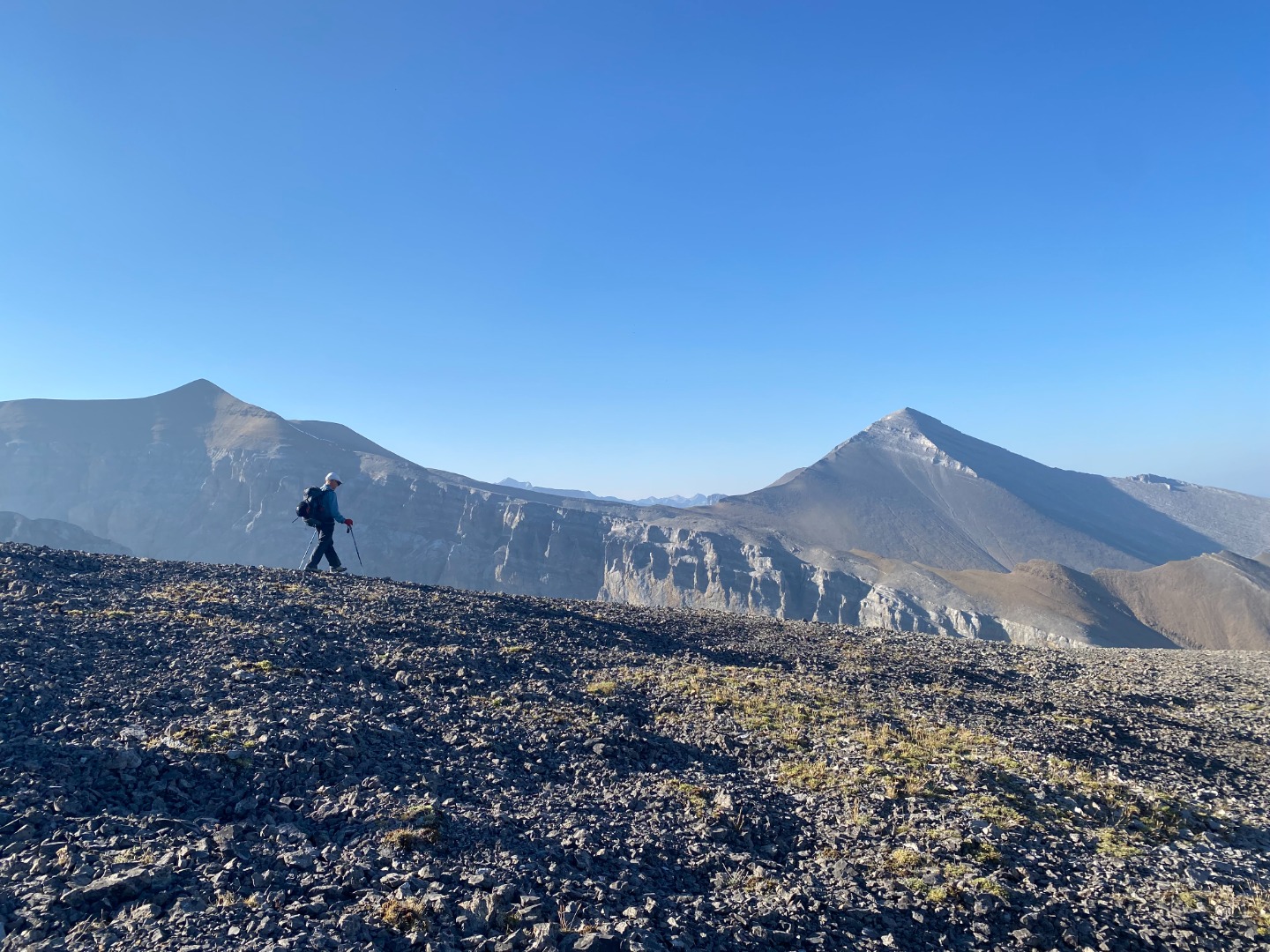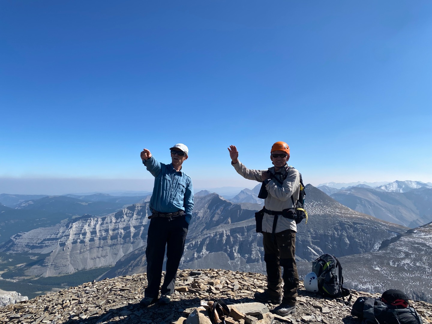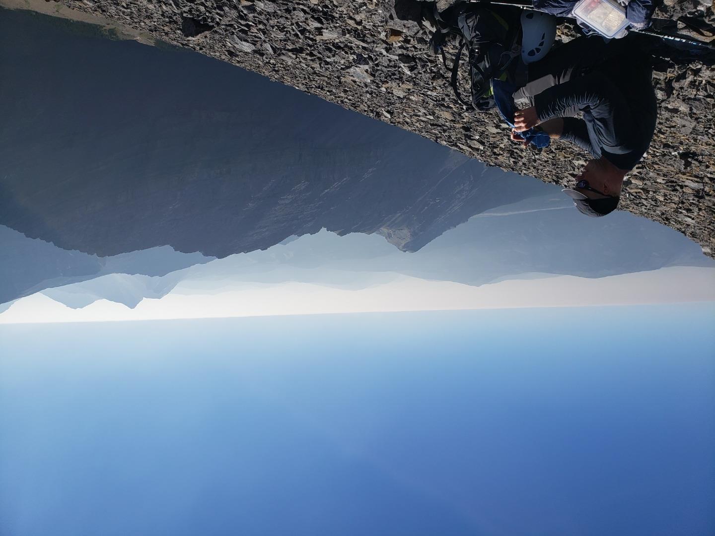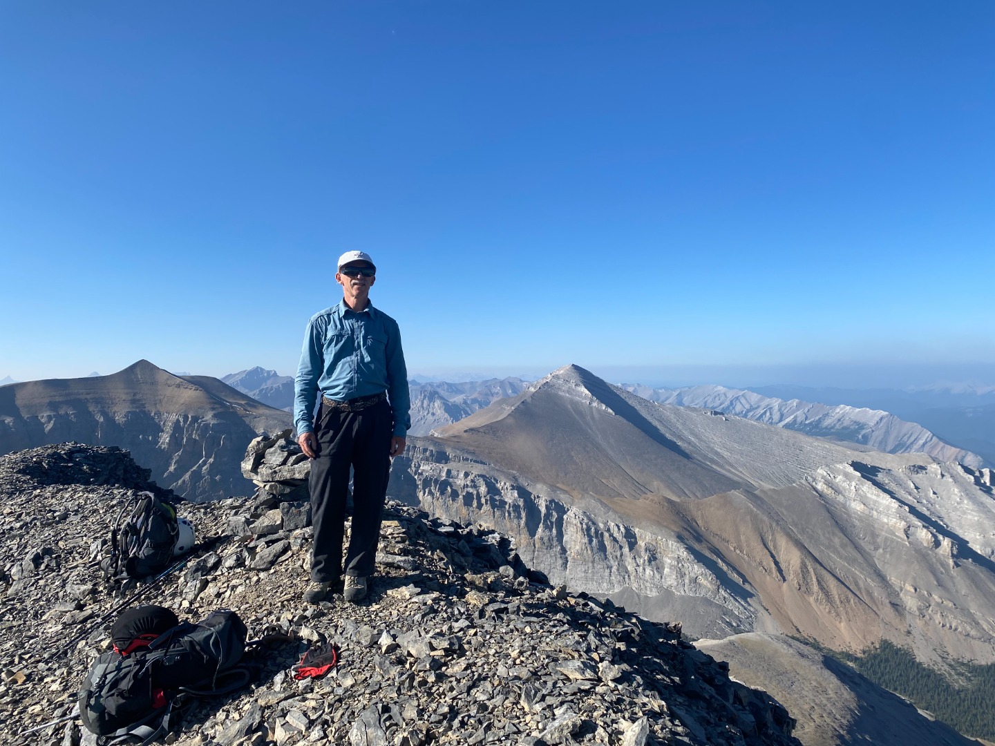There is something about this four peak traverse that keeps drawing me back; this was my fifth time doing it, in a variety of different ways, and twice before with the Ramblers, the first time in the mid-1980s, and most recently in 2009. On this occasion we had excellent weather for this long day trip: not a cloud all day, no wind, not too hot, and not too cold, but there was some haze from smoke. We started from the Little Elbow parking lot at 7:15 am, and rode our bikes along the Big Elbow to South Glasgow Creek, about 4 km. We then walked up South Glasgow Creek, sometimes following a faint trail on the north side of the creek, and sometimes walking in the creek bed. We arrived at the summit of Mount Glasgow at 12:00 noon, 4.75 hours after leaving the parking lot. After a 30 minute break, and just as we were about to head for Mount Cornwall, two young scramblers arrived on the summit, having taken the north ridge route up from the Little Elbow. They were also doing the four peak traverse, but without bikes. They had run up the Little Elbow road from the Little Elbow car campground, and were planning to run back to the campground along the Big Elbow. Amazing!