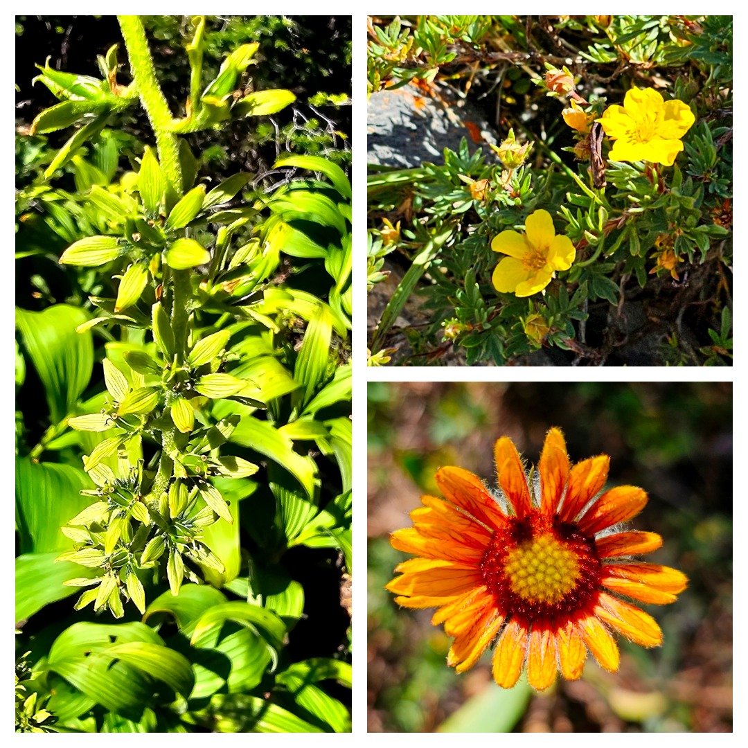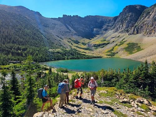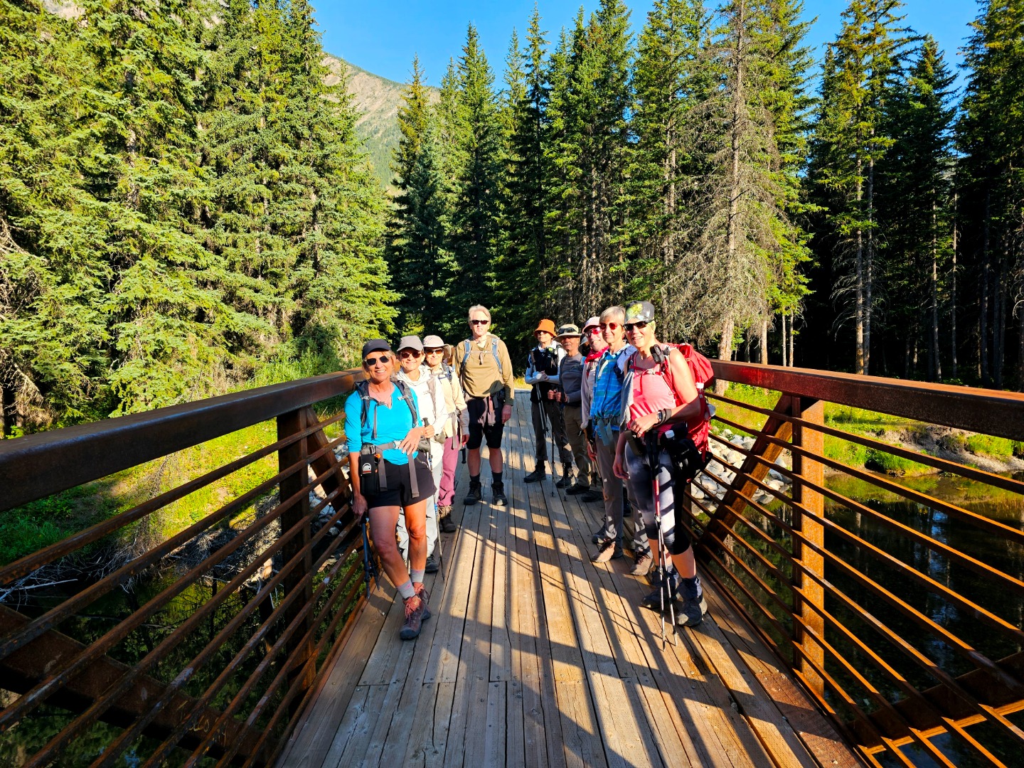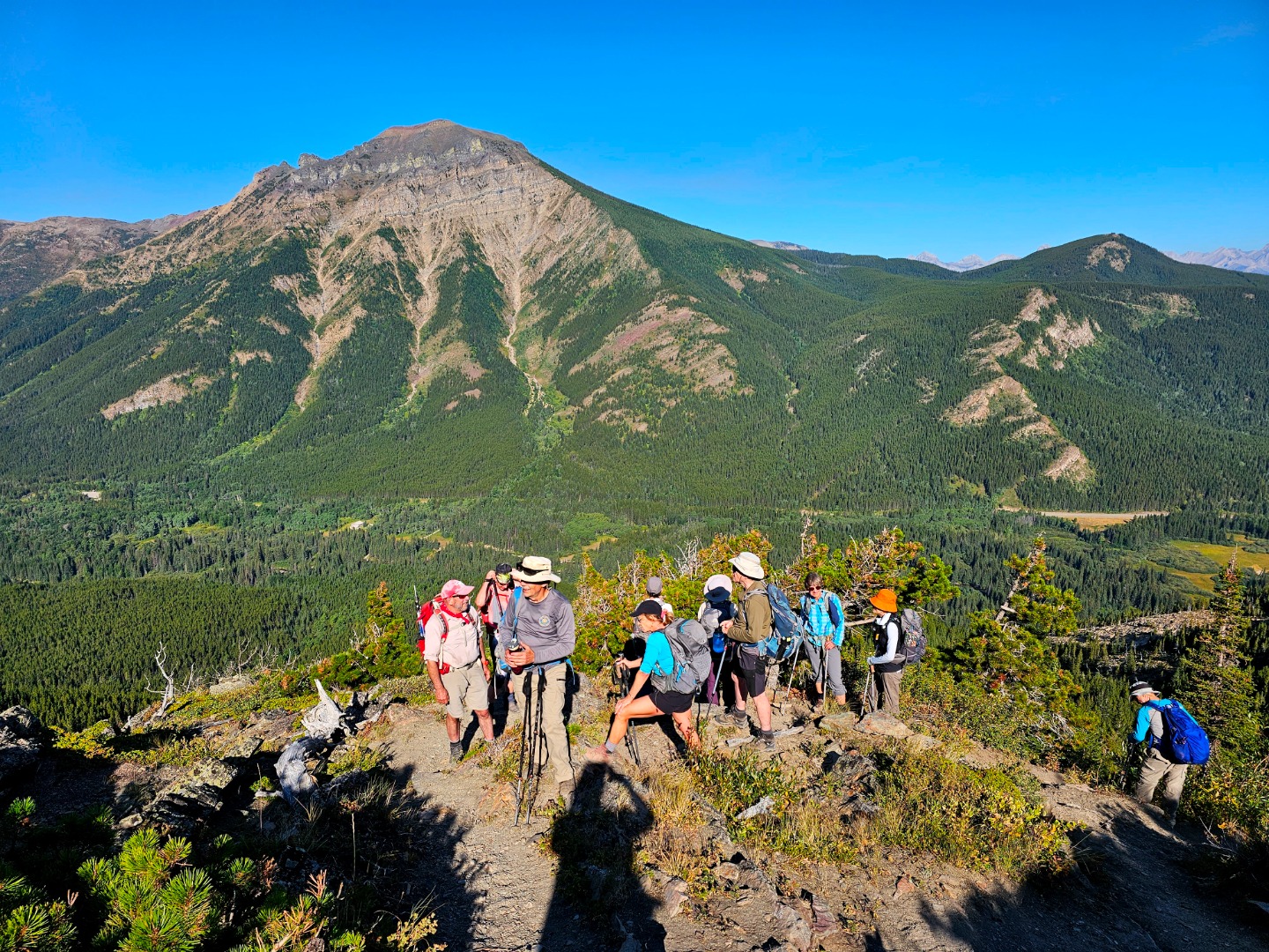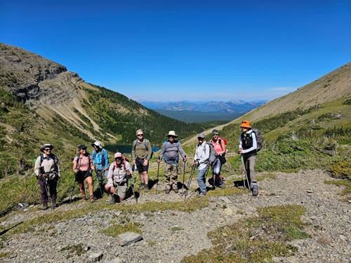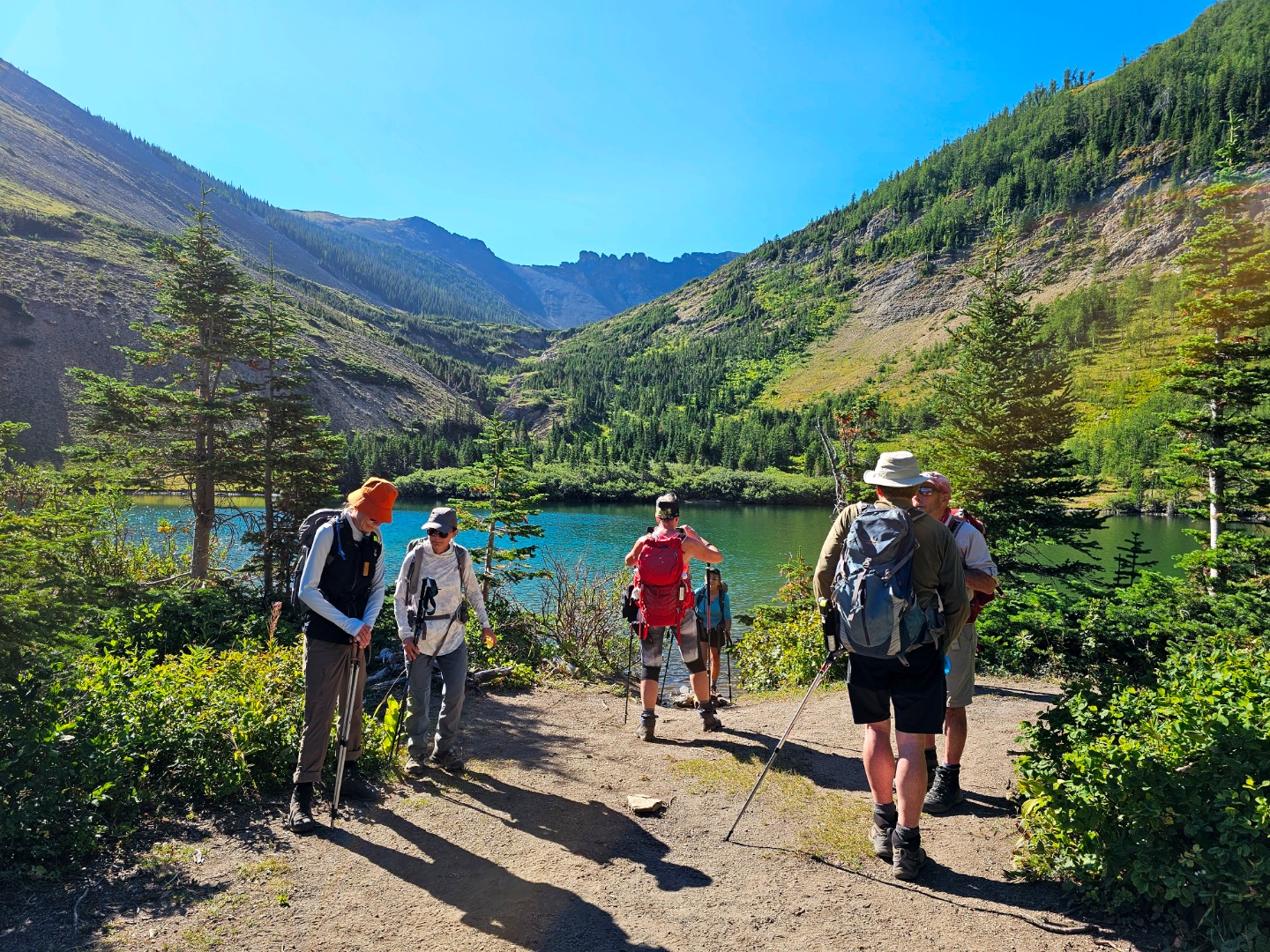 It was another beautiful day in the mountains of Castle Provincial Park. The trailhead of this hike starts at Syncline Barnaby Staging Area. It has a nice parking lot with picnic tables. We started walking at about 8:30 am. After crossing highway 774 we walked about 1.5 km to the Southfork Lakes – Barnaby Ridge trailhead. We arrived at the first Southfork Lake at about 10:30 am. The steepest part of the trail was before the first lake. It was a gentler climb though the forest to the second lake. We stopped briefly at the second lake to take some pictures enjoying beautiful scenery. Then we continued a short distance to the third lake. We arrived at the third lake at about 11:00 am. Two Ramblers decided to climb the ridge above the third lake and have lunch there. The rest of us stayed at the third lake where we had lunch. We entertained ourselves with skipping rock competition and story telling.