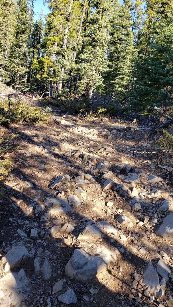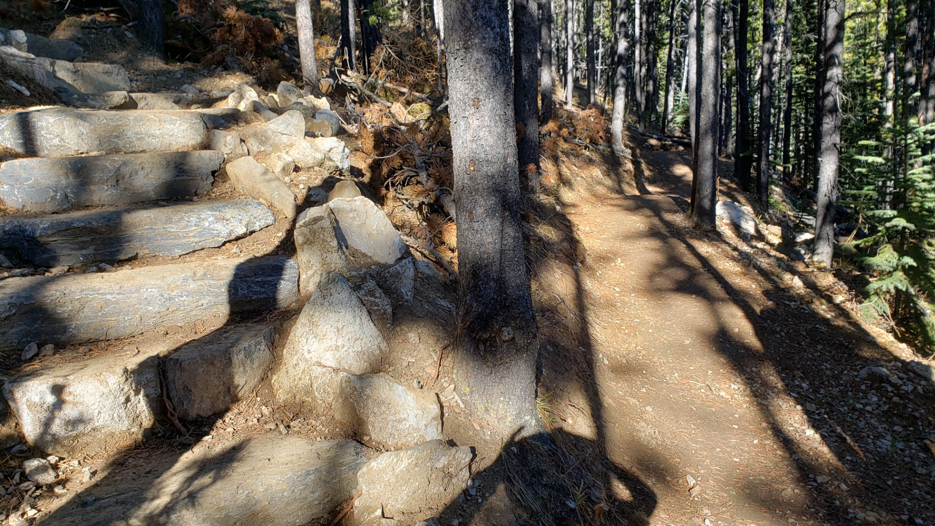 A peculiar feature is the building of two sets of stone steps just barely cutting off the end of the switchbacks. It is both easier and faster taking the trail like the mountain bikers, rather than these short stone step segments.