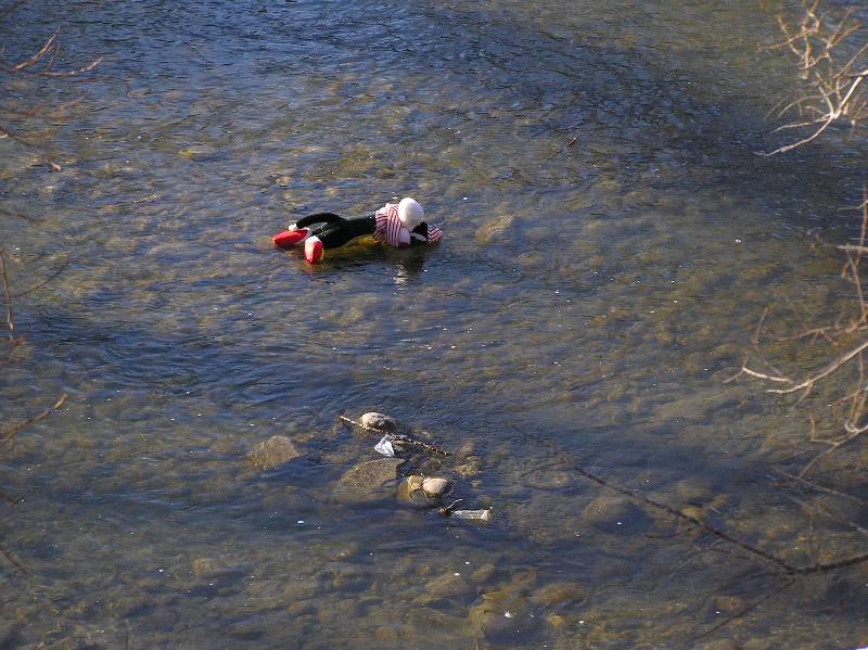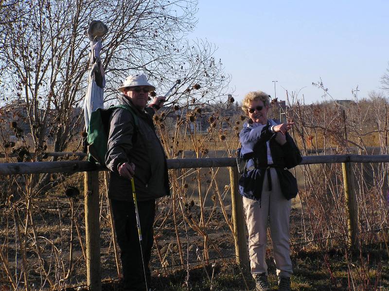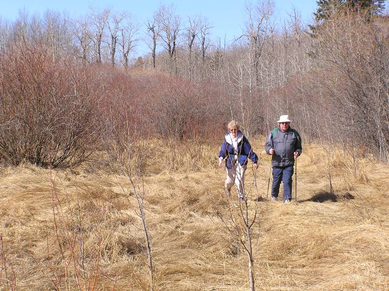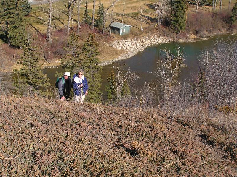After our lunch break, at the 14 km point in our hike, we continued along a well travelled trail along the shore of the reservoir until we reached the Calgary Rowing Club. With hindsight, it would have probably been a wise decision to rejoin the pathway system at this point but the vestiges of a trail beckoned and we continued along the shoreline to the Earl Grey Golf Course. At this point the trail we had been following petered out. Two members of our group opted for the high road and walked along the top of the escarpment, being very careful to stay on the reservoir side of the white property stakes and avoid trespassing on the hallowed grounds of one of Calgary oldest private golf clubs. Your erstwhile coordinator opted for the low road and tried to forge a trail along the ever narrowing shoreline. At this point I should emphasize that this is not now or ever will be the recommended route.