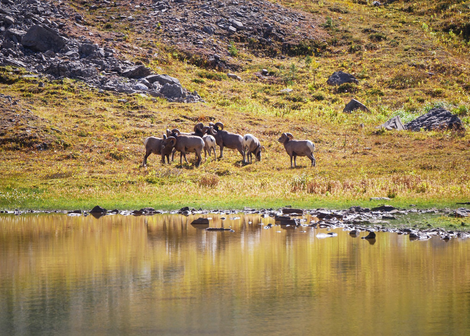 A perfect day for a walk in the mountains! The larch are not far along yet in the color change, with the most advanced being found at the upper margins. An after lunch highlight was observing a group of rams by the lower tarn in 3 Lakes valley. Thanks, John Gapp, for taking on a second group who left 30 minutes earlier, after my trip became way oversubscribed.