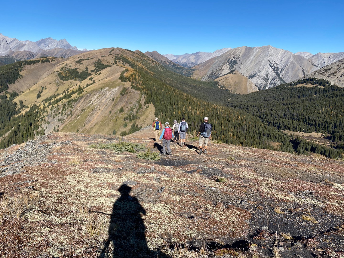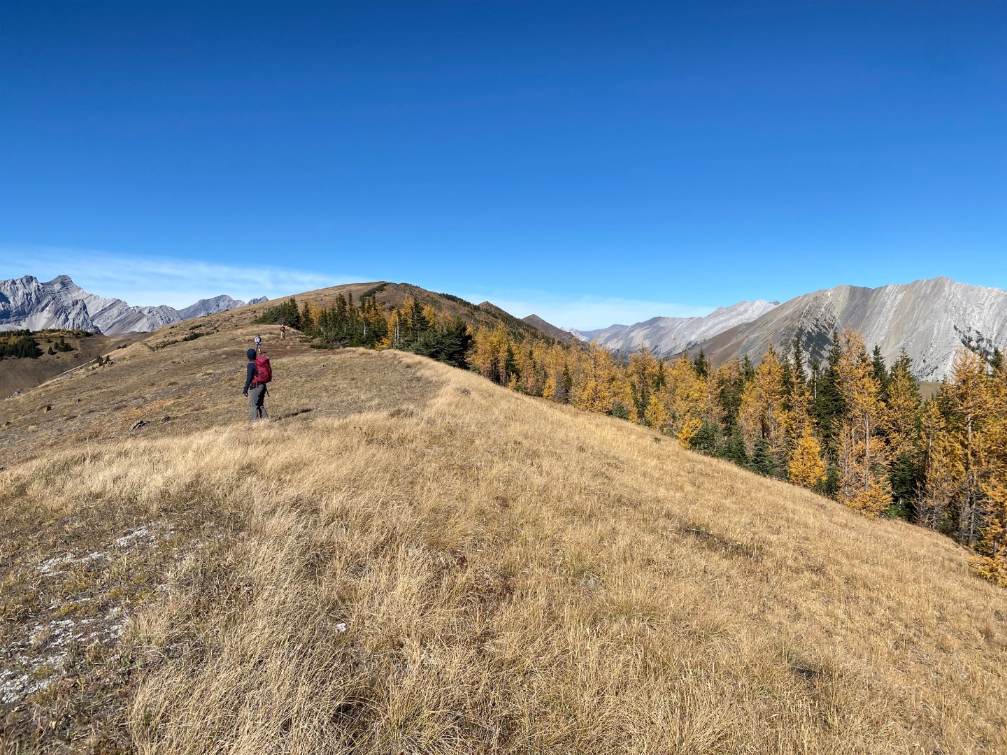 We had a lovely day in a beautiful area, travelling through Picklejar Pass to the N, SE, and SW Mist Hills. Our efforts on the very steep slopes onto and off of each hill were rewarded with long sections of open ridge walking (which is of course why we were there). The larches were deep gold and starting to lose their needles. We had breaks on all 3 hills in warm sun and it was extremely difficult to get up and keep going… I could easily have spent a couple of hours lying on the slopes enjoying the good conversations that we were having. Thanks to everyone for a wonderful day! 13 km/1000m.