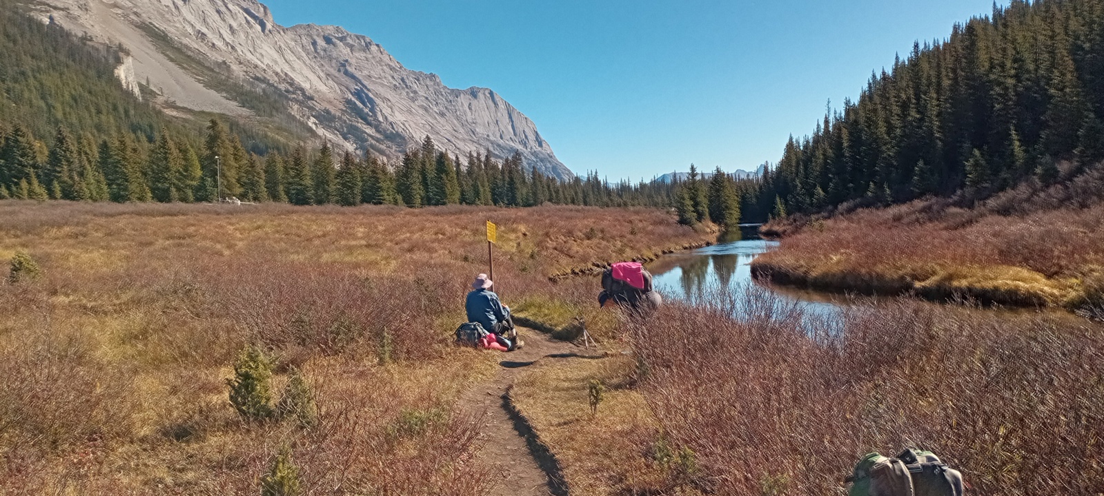 Despite the perfect weather we only saw 2 runners, 3 campers 2 thru hikers and 2 other hut users in the four days. On Oct 08, we appeared to have the entire park to ourselves. Larches were past their best but still very presentable. With approx 12 hours of darkness, the nights were long and cool outside (-3c), but during the day it reached +10c in the shade and warmer in the sun. Only minor wind. We managed to get the wood stove functioning in the hut. After Oct 01, the Naiset huts are free and mattresses are provided. No services are provided by Assiniboine Lodge which is locked up.The campground is open. For further info see: https://assiniboinelodge.com/