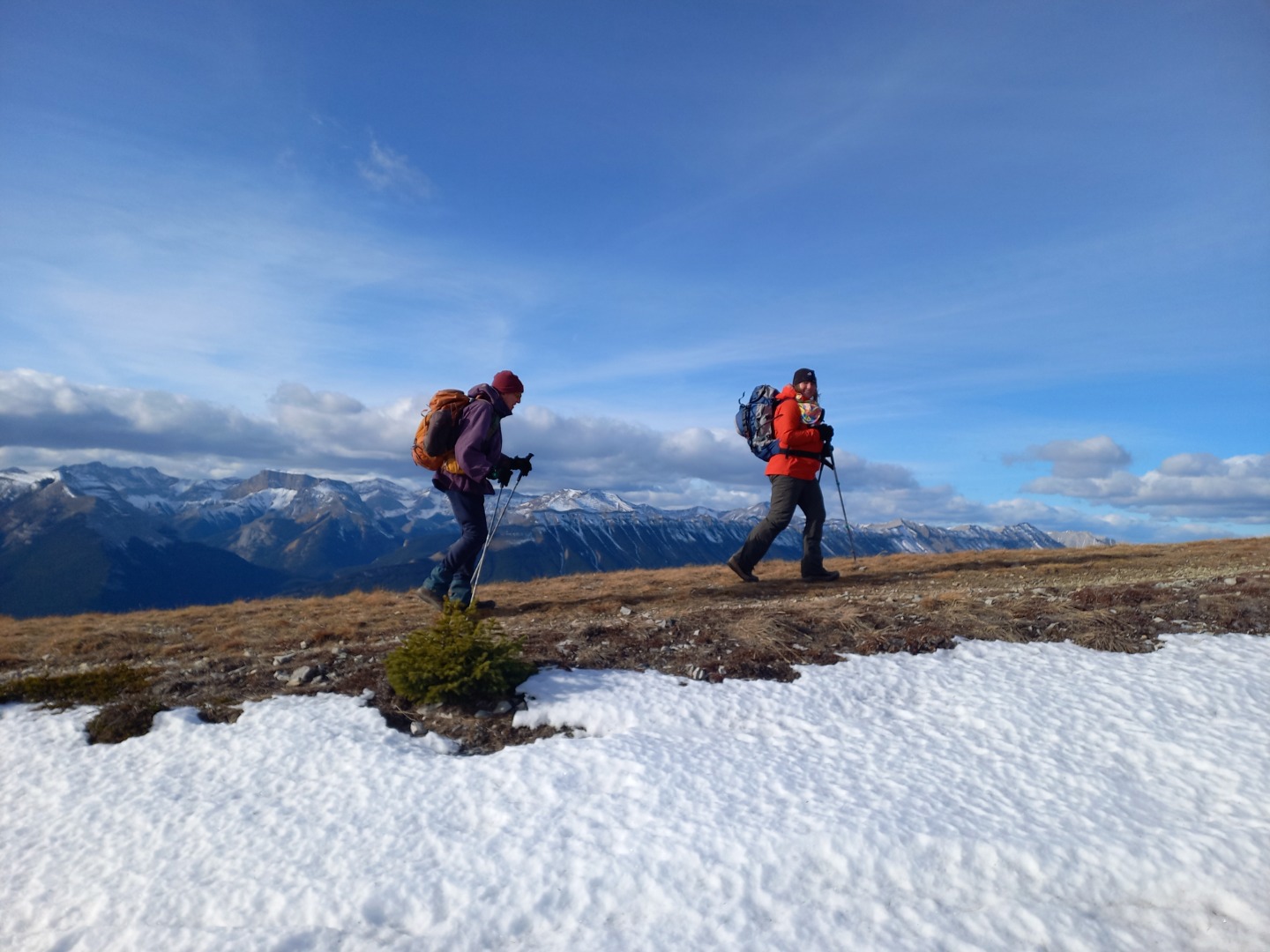 10:14 Our group of nine set out under sunny skies a light breeze and warm conditions.11:00 We observed two minutes of silence to honor the brave men and women that fought to defend our freedoms from the socialist scourge.12:40 After a windy and cold ridgewalk we reached the north summit, we didn't linger long before retreating to the lee side of the ridge for our lunch break.13:20 Started down,taking a shorter route to the shelter of the trees. Some choose to cross the river just in front of the parking lot and others took the longer option over the bridge.