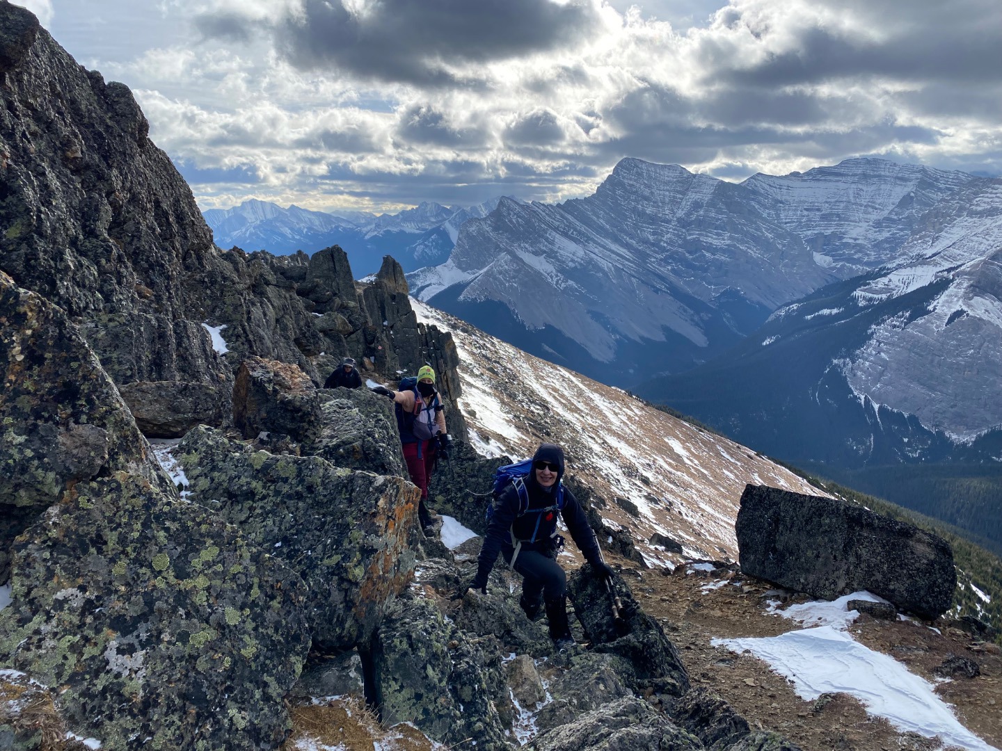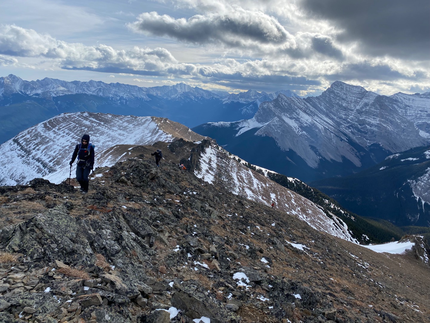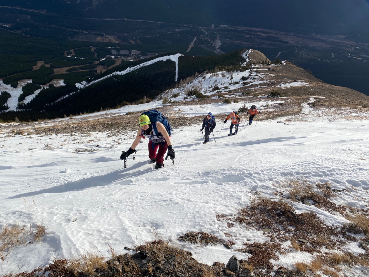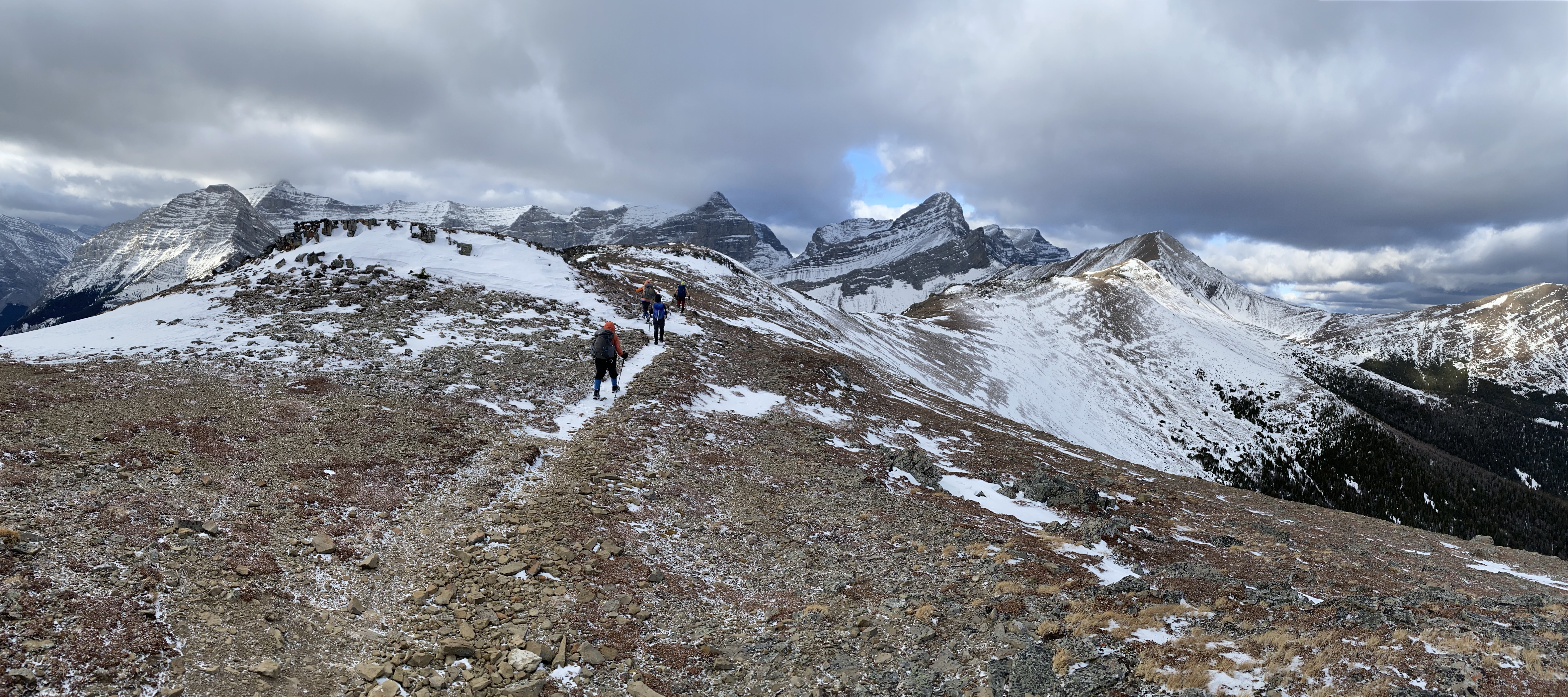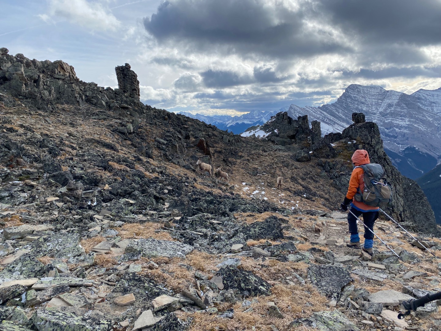 The crux of the day was breaking trail up the snowy treed section just below Olympic Summit, but the reward was spectacular views of snowy mountains and the fascinating environment of the Rock Garden. After pausing at 11:00 to reflect on Remembrance Day, we continued to the high point beyond the Rock Garden before turning around. A bonus was a close encounter (only metres away) with a ewe and her two lambs.