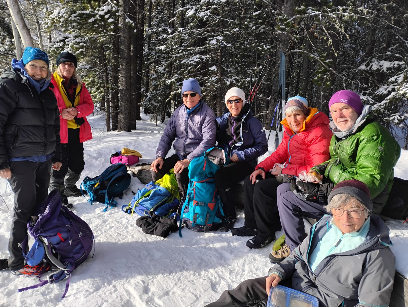 It was -8 (rising to -3 by the end of the day) at the trail head with a light but cool wind. There is a lot of snow, so much better than last year at any time. The 8 of us were mostly on wax skis except me, who had skin skis but was pining for my wax skis which are great climbers with the right wax and cooler temperatures. Nonetheless, conditions were really very good on all the trails, and the track setting was recent. There were a few thin sections on the Ribbon Creek trail big hill that goes up from the bridge. We had lunch at the “lookout” just before the Coalmine trail and the sun came out providing good views. As we proceeded down the Ribbon Creek Parking and back up to Aspen and the final run down to the cars, we heard several avalanches that sounded like they were on Mt Kidd. Another great day in the mountains – no wind and a nice temperature, great snow conditions and grand company.