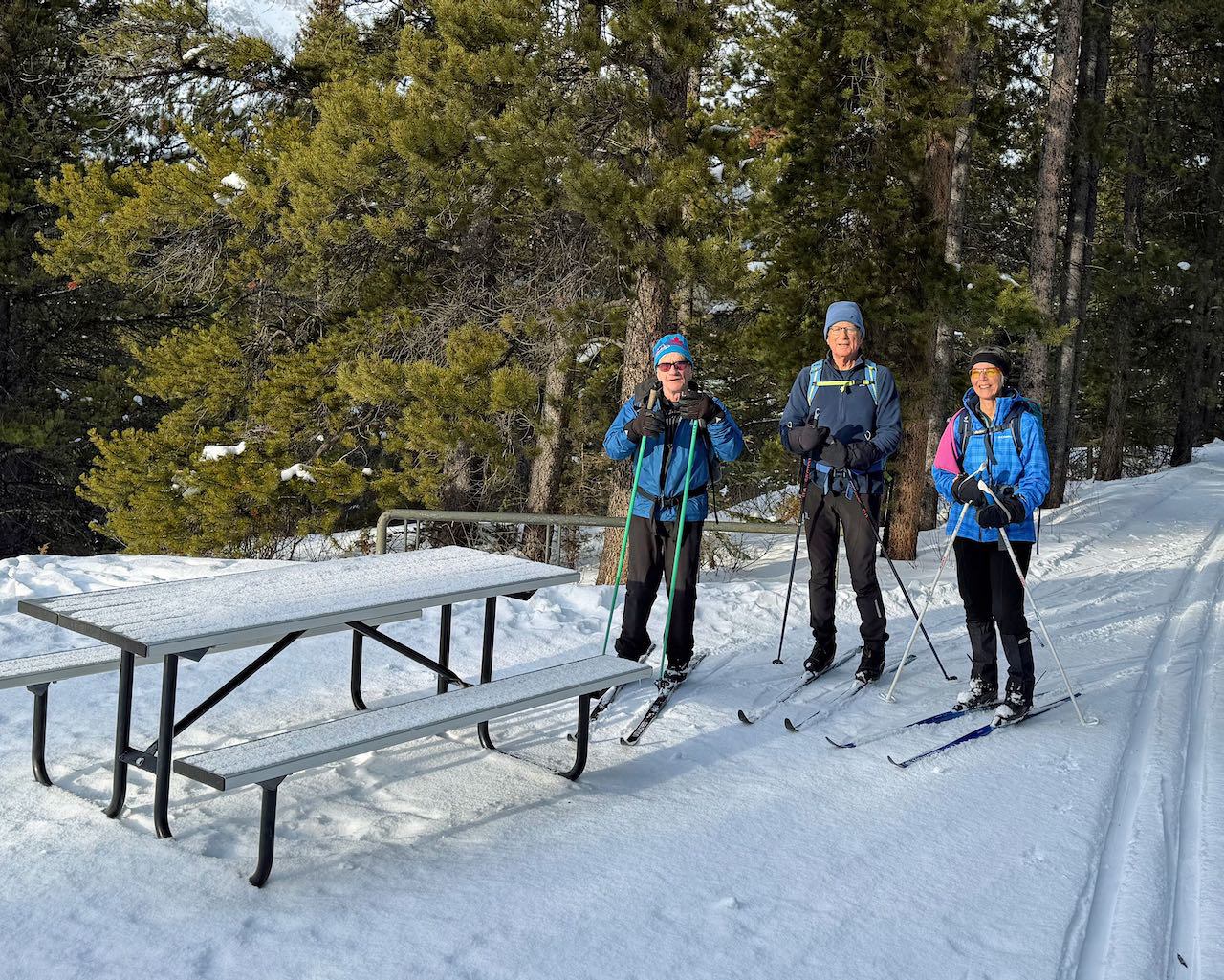 We booted up in comfort in the visitor centre and set out at 10. But before that we ran into Chip and Cathy, also electing to ski from there. There was a dusting of fresh snow, but also quite a bit of debris under that. We flicked a lot of stuff off the trails. Then we encountered this on Meadow.