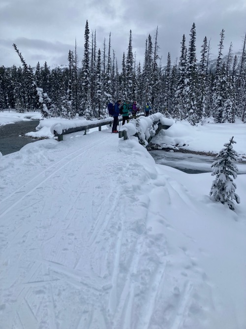 After lunch, it was back to the Upper Tramline. En-route a downed tree across this section of trail necessitated a short detour into the bush. Let's hope this is cleared before the LL-Banff Loppet. At the base of Tramline, we all opted to do the Bow River loop. A very scenic but flat route along the river to a pedestrian bridge and then return.