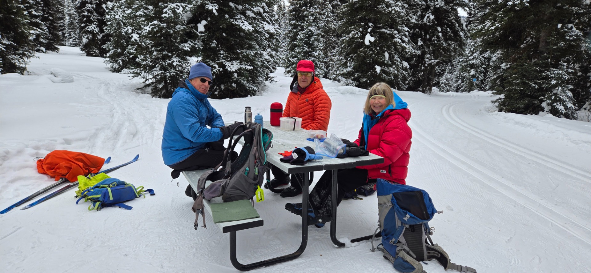 We all agreed that the ski day was a good one. The wax we used was a combo of blues and purples and worked quite well as we climbed up Whisky Jack and made our way across the snowy meadows of Tyrwhitt. After lunch at the Tyrwhitt picnic table, we went to Elk Pass where we encountered a group of costumed women going to the Elk Lakes. It looked like a fun party – sadly we were not invited. The trip back to the car was fast – good snow and grooming with enough cones scattered about that you had to keep your wits about you! Fox Creek and Moraine were much better than I expected. Fox in particular was a wonderland of snow laden trees. The only thing missing from the day was sun, but hey, no sun keeps the snow fresh.