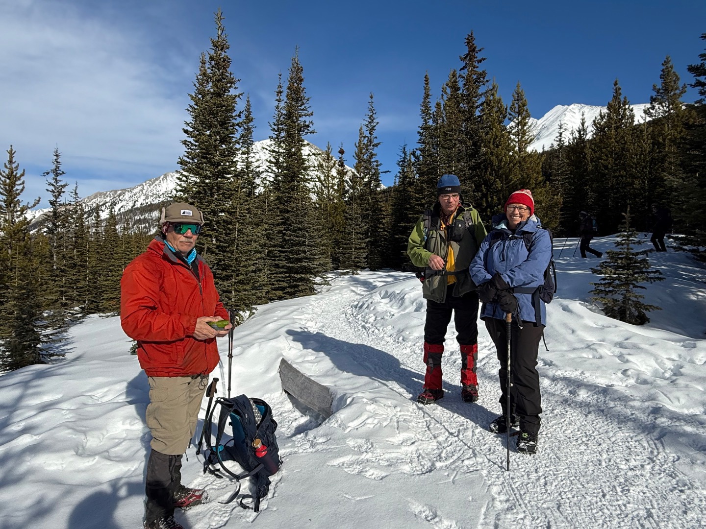A sun filled with warm winter temp day was presented as we made our way to the lake. Deep snow here this year, packed trail, reasonable pace. The area being a little busy was still ok, the wonderful mountain setting made things right. Participants: Kim, Cornelis, Lenard, Cheryl I thank those for joining on this outing.. Scribe, Lenard.